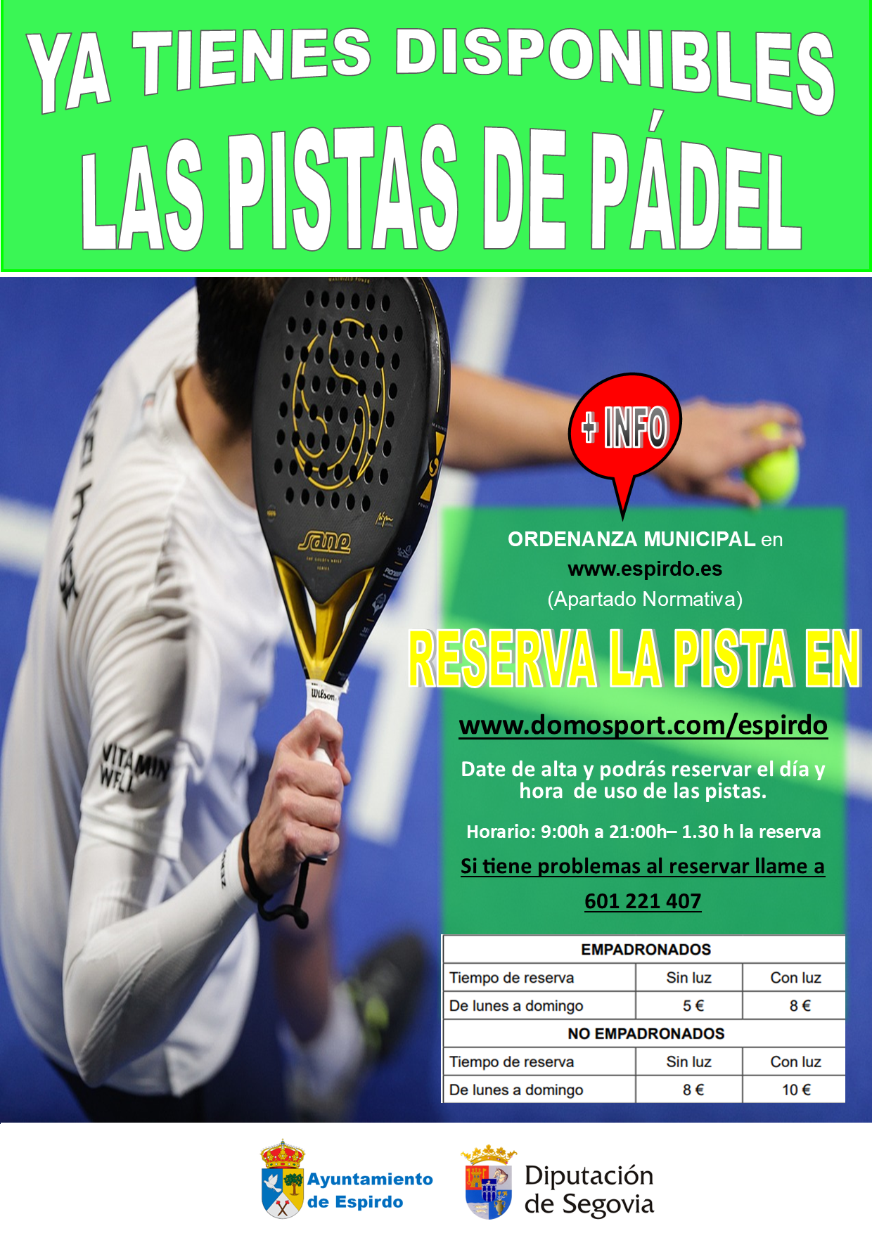 La reserva la pista de pádel de Espirdo se hará a través de Domosport. Información de horarios y precios en el cartel adjunto.