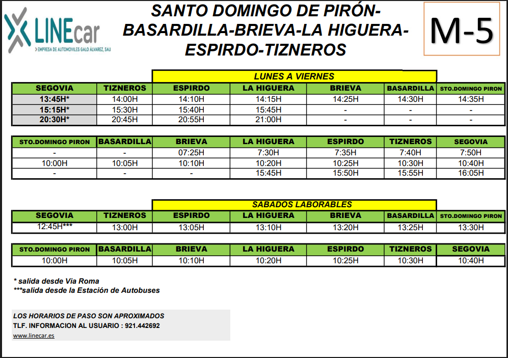 En el cartel adjunto se detalla la Ruta M5 que pasa por nuestros pueblos con los horarios para poder coger el autobús desde el 10 de septiembre de 2021. La Parada en Tizneros y la Higuera será en la marquesina situada para tal fin, mientras que en Espirdo se hará desde ahora en la marquesina de la plaza.